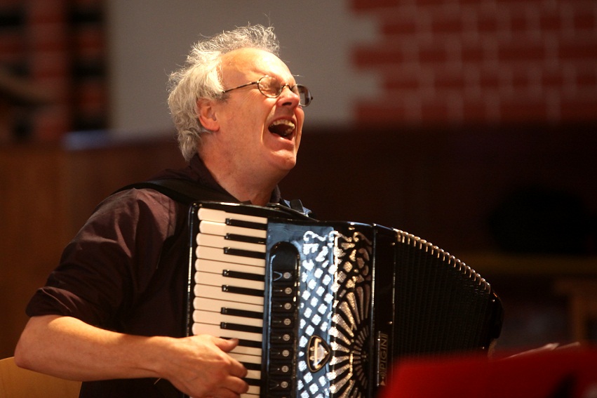 … unterstützt am Akkordeon das gemeinsame Singen de Kanons „Schalom chaverim“ (EG 434), der als Leit-Lied der Woche in sieben Konzerten erklingt.
