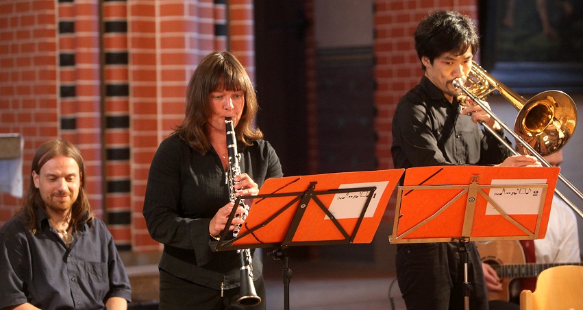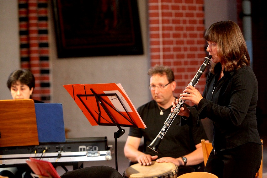 In der Kirche geht der musikalische Abend weiter, mit Klezmer vom Feinsten: Kati Frölian (Klarinette) spielt, begleitet von Lukas Meier-Lindner (Percussion) und Bella Kalinowska (Klavier), „Sholem-alekhem, rov Feidman!“ von Béla Kovács (*1937).
