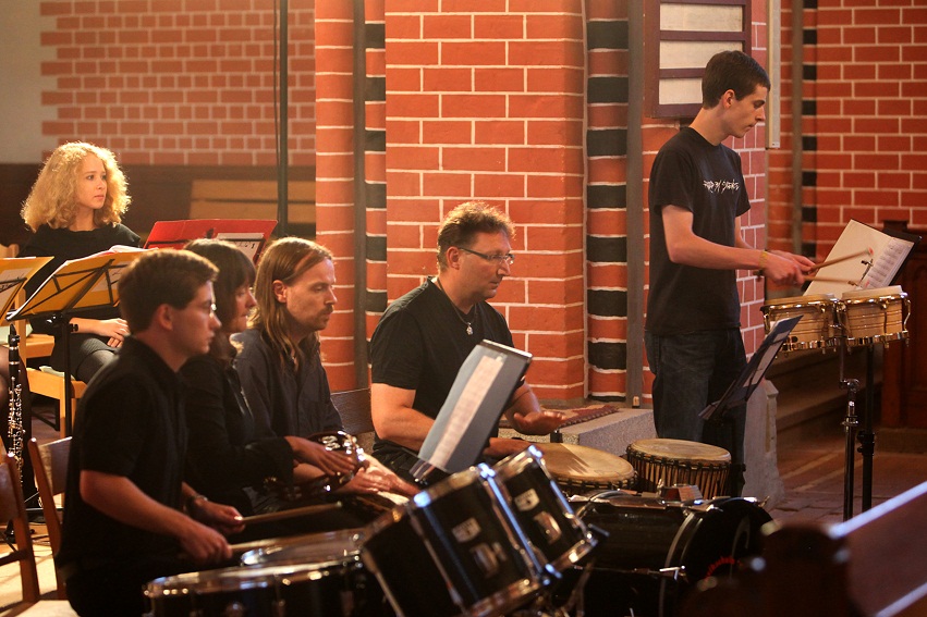 Das Schlagwerkensemble (v.l.n.r.: Frerk Morrin, Kati Frölian, Roy Bleeck, Lukas Meier-Lindner und Julian Oelschlägel) bringt mit dem 1. Satz der „Afrikanischen Skizzen“ des zeitgenössischen Komponisten Vassilis Papadopoulus ungeahnte rhythmische Kräfte hervor.