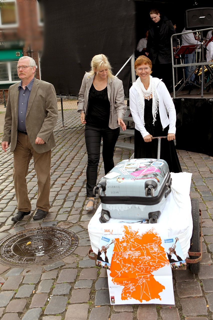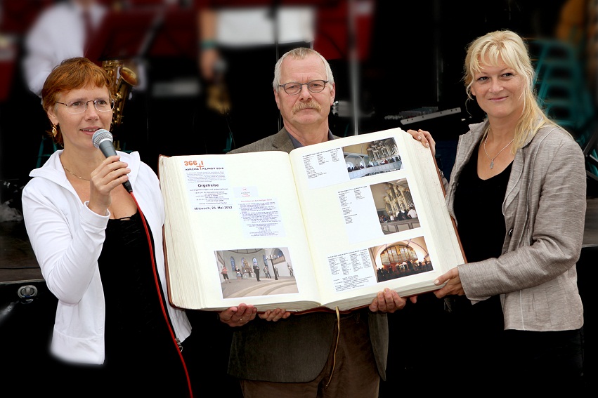 … die Kirchenmusikerin Annerose Lessing (l.) und die 1. Stadträtin von Grevesmühlen, Kristine Lenschow (r.), in Empfang nehmen. Pastor Bernhard Kähler hat sie vom Konzert am Vortag in Wismar mitgebracht.