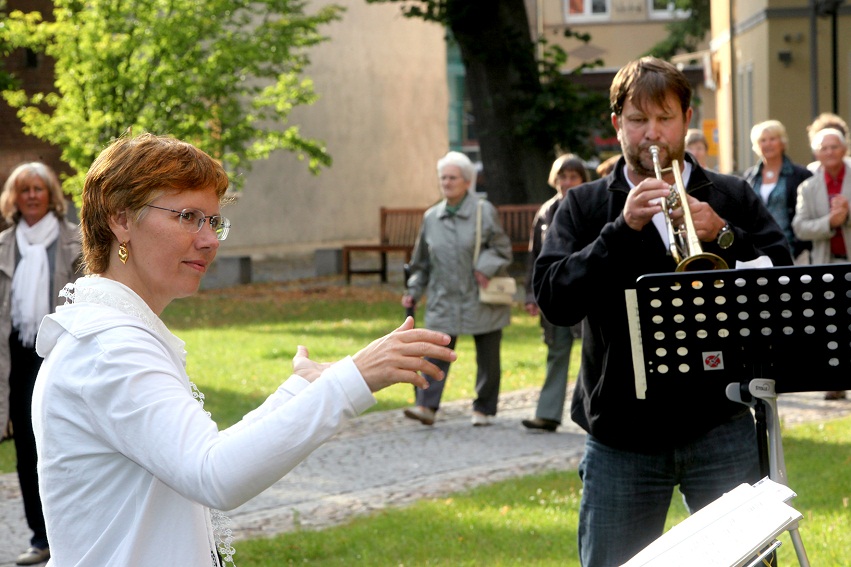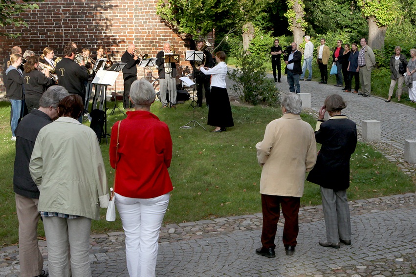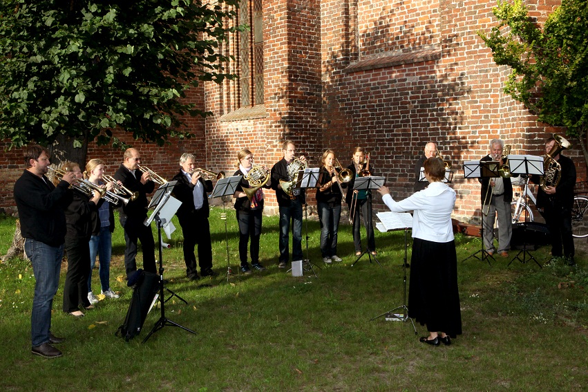 Vor der Kirche empfängt der Ökumenische Posaunenchor Grevesmühlen unter der Leitung von Annerose Lessing mit Klezmer aus dem „Querblechein“ alle Ankommenden, u.a. mit den Stücken „David melech“, „Ose Shalom Bimromau“ und „Hava nagila“.