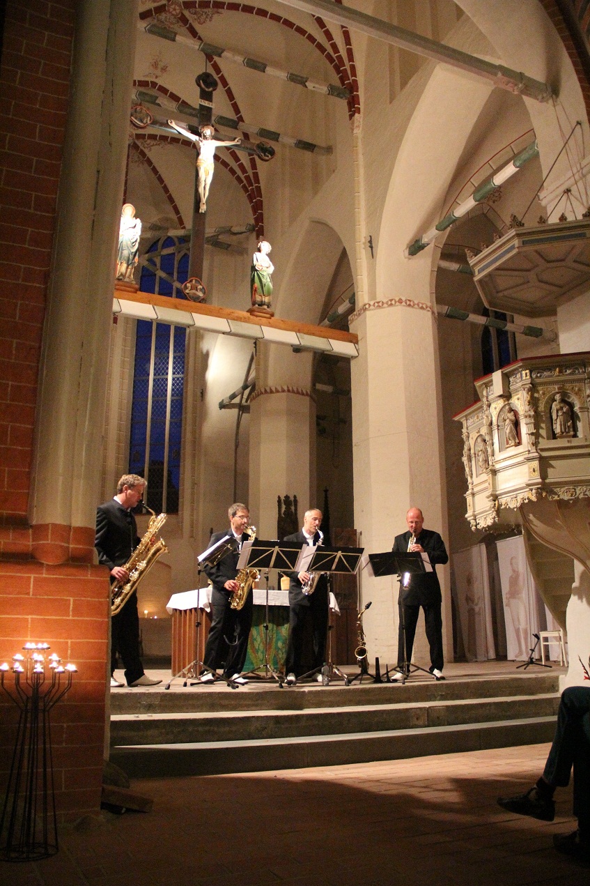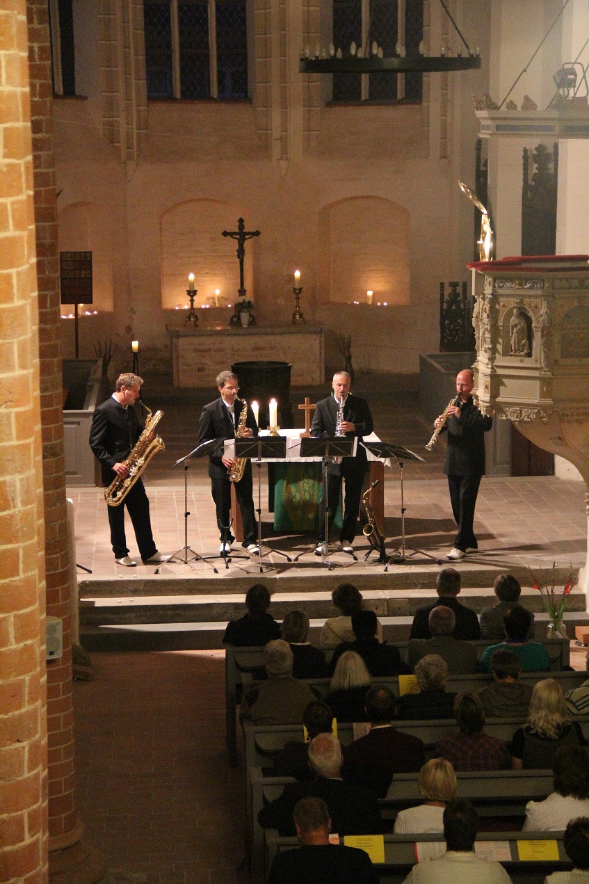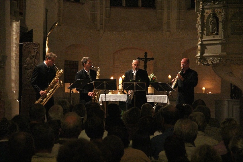 Das Saxophonquartett „Meier’s Clan“ aus Potsdam hüllt das Publikum in wunderbare Klänge ein mit Werken von Heinrich Schütz (1585-1672), Friedrich II. (1712-1786), Leonard Bernstein (1918-1990) und Sting (*1951).