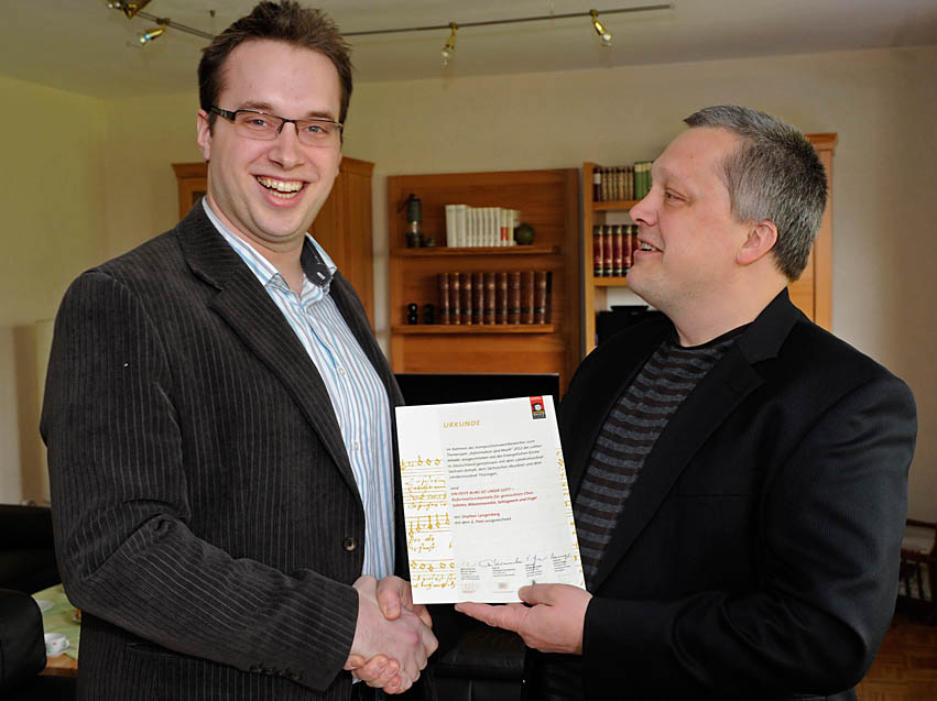 Im Rahmen des Kompositionswettbewerbes zum Themenjahr „Reformation und Musik“ 2012 der Lutherdekade, ausgeschrieben von der Geschäftsstelle der Evangelischen Kirche in Deutschland in Wittenberg, gemeinsam mit dem Landesmusikrat Sachsen-Anhalt, dem Sächsischen Musikrat und dem Landesmusikrat Thüringen, wird „Ein feste Burg ist unser Gott – Reformationskantate für gemischten Chor, Solisten, Bläserensemble, Schlagwerk und Orgel“ von Stephan Langenberg (*1985) mit dem zweiten Preis ausgezeichnet. Klaus-Martin Bresgott (r) vom Kulturbüro des Rates der EKD überbringt dem Komponisten die Urkunde in dessen Heimatstadt Oberhausen. Foto: Andreas Schoelzel