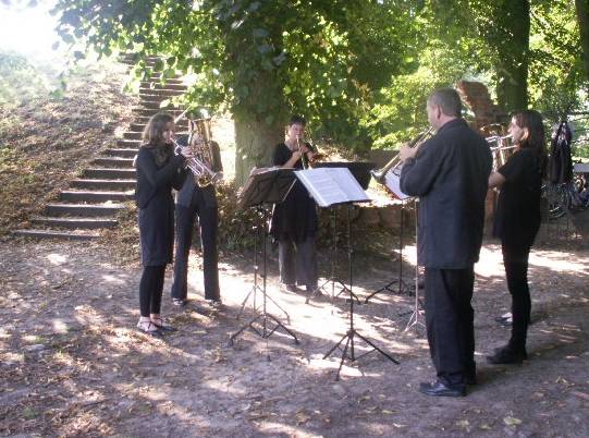 „The Goethles“ begrüßen die Gottesdienstbesucher am Haupttor des Kirchhofes mit geistlicher Musik aus der Reformationszeit.