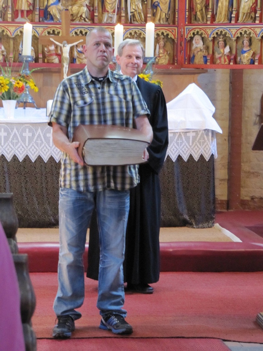 … und zeigt gemeinsam mit dem Kirchenältesten Rico Zehr der Gemeinde die Chronik, die nach dem Gottesdienst nach Russow weiterreist.