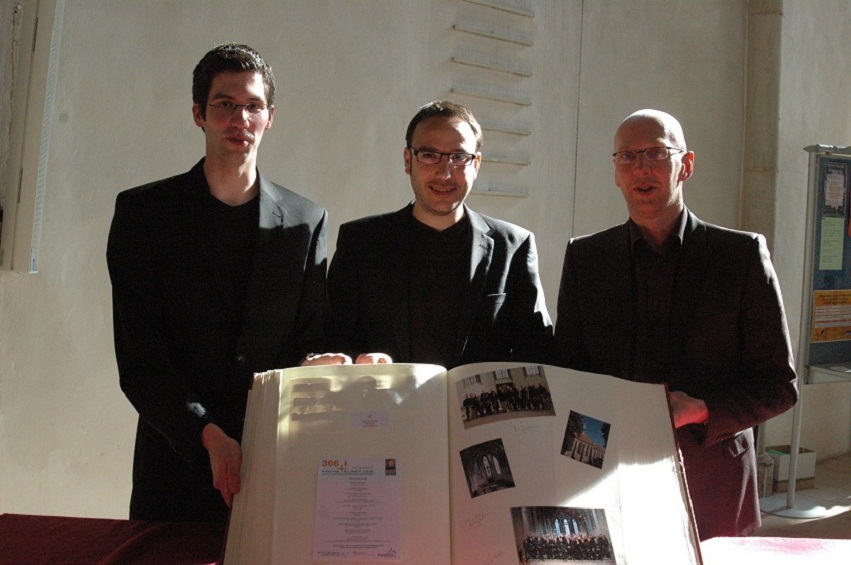 Den Münsteraner Eintrag in die Chronik präsentieren nach dem Konzert (v.l.n.r.) Kai Koch, Traugott Fünfgeld und Volker Grundmann.