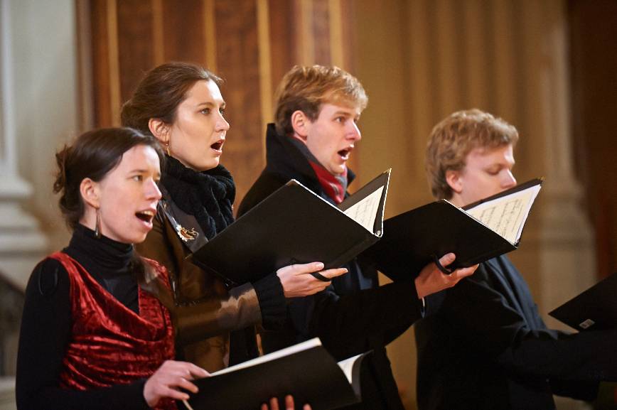 Das Solistenquartett – Maria Meckel (Sopran), Katrin Valk (Alt), Christian Hacker (Tenor) und Raphael Hering (Bass) (v.l.n.r.) – leuchtet mit dem Choral „Lobt Gott den Herrn der Herrlichkeit“ von Johann Sebastian Bach (1685 – 1750)