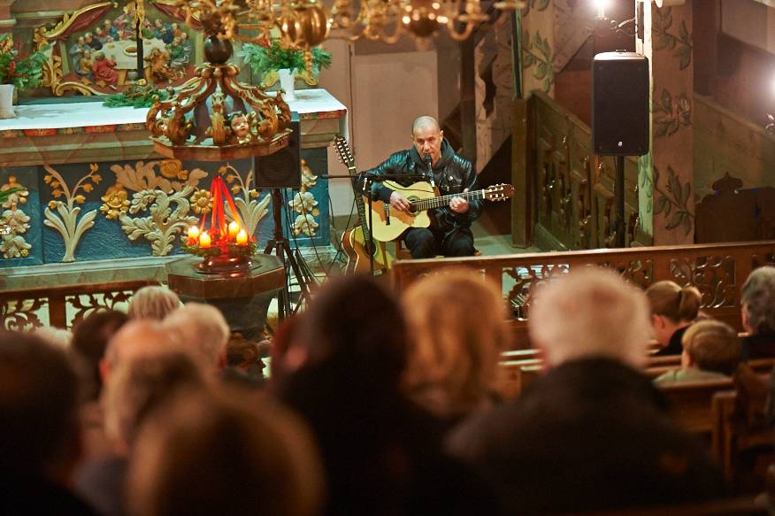Heinz Eggert, Staatsminister a.D. und in den 1980er Jahren Pfarrer in dieser Kirche, begrüßt die Konzertbesucher und führt mit Worten aus seiner Weihnachtspredigt von 1988 in das Konzert mit dem Liedermacher Stephan Krawczyk ein