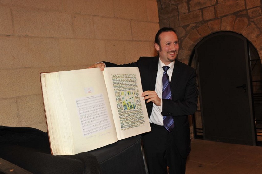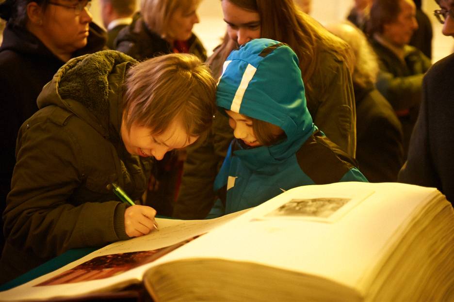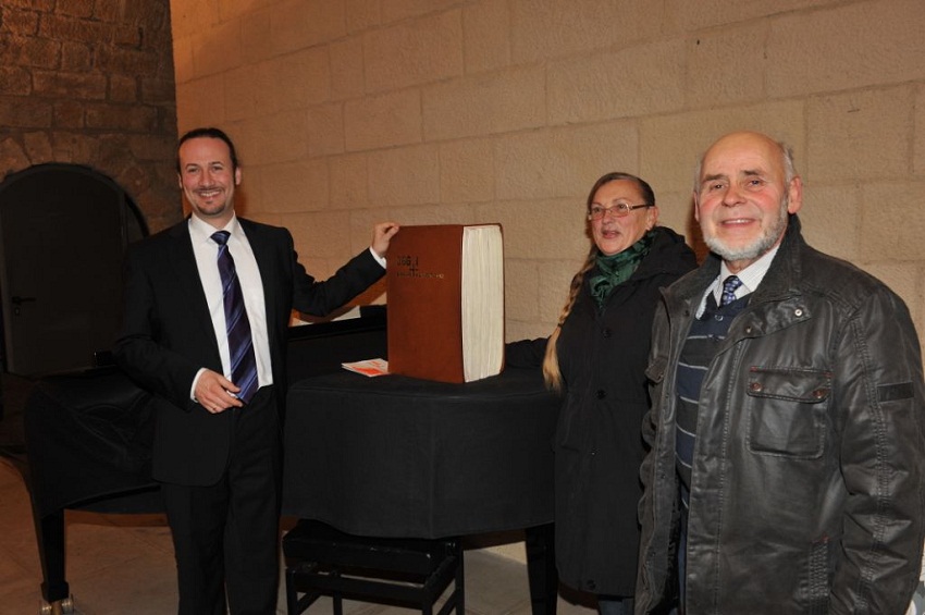 Prof. Georg Christoph Biller (3.v.r.) und der Leipziger CDU-Bundestagsabgeordnete Dr. Thomas Feist (l) präsentieren gemeinsam mit Angelika Beer (r) vom Kulturbüro des Rates der EKD und einigen Ensemble-Mitgliedern nach dem Konzert den Chronik-Eintrag der Thomaner