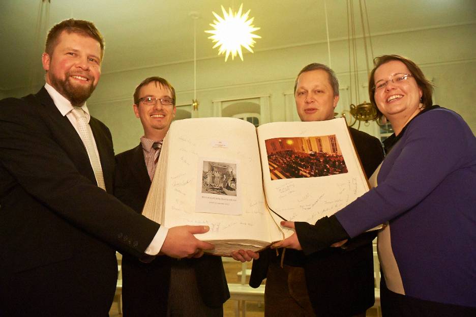 Die Fotos vom musikalischen Festschluss unter dem einzigen Herrnhuter Stern mit 110 Zacken, eine Sonderanfertigung für den Kirchensaal in der Herrnhuter Brüdergemeine, sind von Andreas Schoelzel. Den fertigen Herrnhuter Chronikeintrag präsentieren Liturg Olaf Nippe, Kantor Peter Kubath sowie Klaus-Martin Bresgott und Angelika Beer vom Kulturbüro des Rates der EKD (v.l.n.r.)